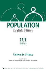 Unions in France Results from the study of individual and conjugal trajectoriesVol. 74, 2019/1 - pagesPages 7 to 10IntroductionBy Wilfried Rault, Arnaud Régnier-Loilier, translated by Catriona DutreuilhPages 11 to 40Studying individual and conjugal trajectories in France: Scientific and methodological choices in the EPIC surveyBy Wilfried Rault, Arnaud Régnier-Loilier, translated by Paul ReevePages 41 to 70From tradition to personalization: Changing marriage norms in France since the 1960sBy Florence Maillochon, translated by Catriona DutreuilhPages 71 to 100New partner, new living arrangements? The process of repartnering after separationBy Arnaud Régnier-Loilier, translated by Beatrice van Hoorn AlkemaPages 101 to 126Uncoupled: Experiences of singlehood in contemporary FranceBy Marie Bergström, Françoise Courtel, Géraldine Vivier, translated by Harriet ColemanPages 127 to 148Once homogamous, always homogamous? Educational level and career similarity of couples in France who meet at schoolBy Milan Bouchet-Valat, Sébastien Grobon, translated by Amy Jacobs-ColasPages 149 to 166Some features of second cohabiting relationshipsBy Vianney Costemalle, translated by Amy Jacobs-ColasPages 167 to 186Homosexuality and bisexuality: Contributions of the EPIC survey of individual and conjugal trajectoriesBy Wilfried Rault, Camille Lambert, translated by Paul Reeve