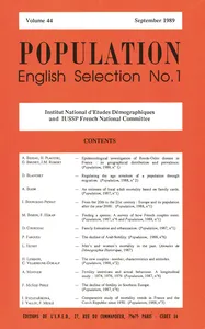 Population: English Selection No. 1 English selection 1, 1989/ES1 - pagesPages 1 to 1ForewordBy Gérard CalotPages 3 to 22Epidemiological investigation of Rendu-Osler disease in France: Its geographical distribution and prevalenceBy J.M. Robert, Guy Brunet, Henri Plauchu, Alain BideauPages 23 to 37Regulating the age structure of a population through migrationBy Didier BlanchetPages 39 to 56An estimate of local adult mortality based on family cardsBy Alain BlumPages 57 to 90From the 20th to the 21st century: Europe and its population after the year 2000By Jean Bourgeois-PichatPages 91 to 121Finding a spouseBy François Héran, Michel BozonPages 123 to 146Family formation and urbanizationBy Daniel CourgeauPages 147 to 175The decline of Arab fertilityBy Philippe FarguesPages 177 to 201Men’s and women’s mortality in the pastBy Louis HenryPages 203 to 235The new couplesBy Catherine Villeneuve-Gokalp, Henri LeridonPages 237 to 259Fertility intentions and actual behaviour. A longitudinal study: 1974, 1976, 1979By Alain MonnierPages 261 to 290The decline of fertility in southern EuropeBy Francisco Munoz-PerezPages 291 to 321Comparative study of mortality trends in France and the Czech Republic since 1950By Jacques Vallin, Jitka Rychtaříková, France Meslé